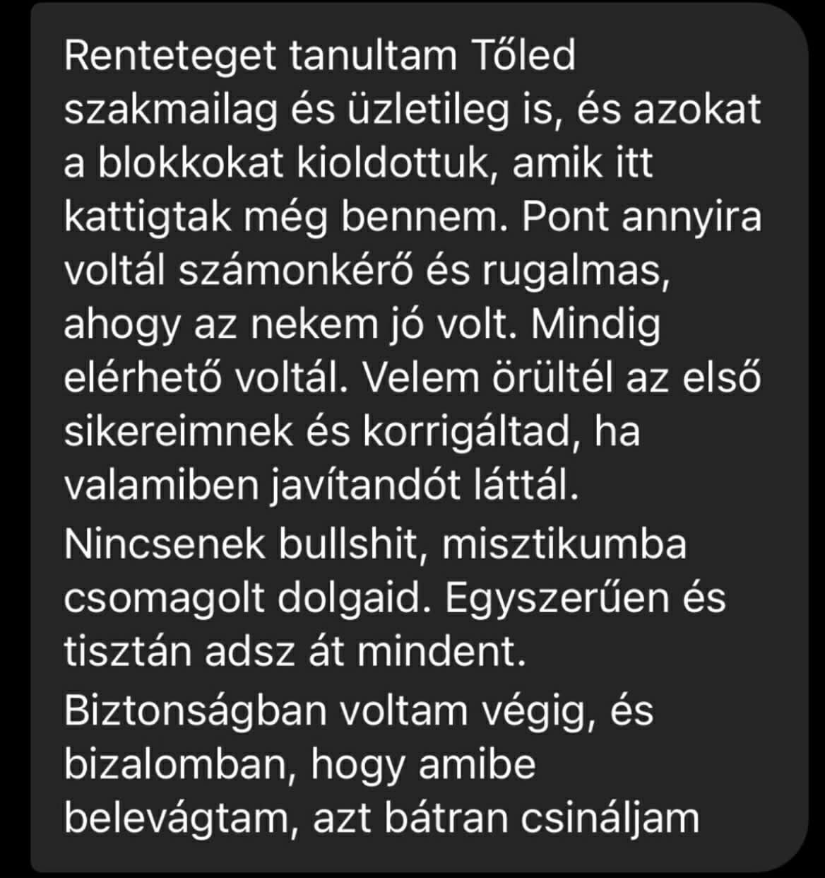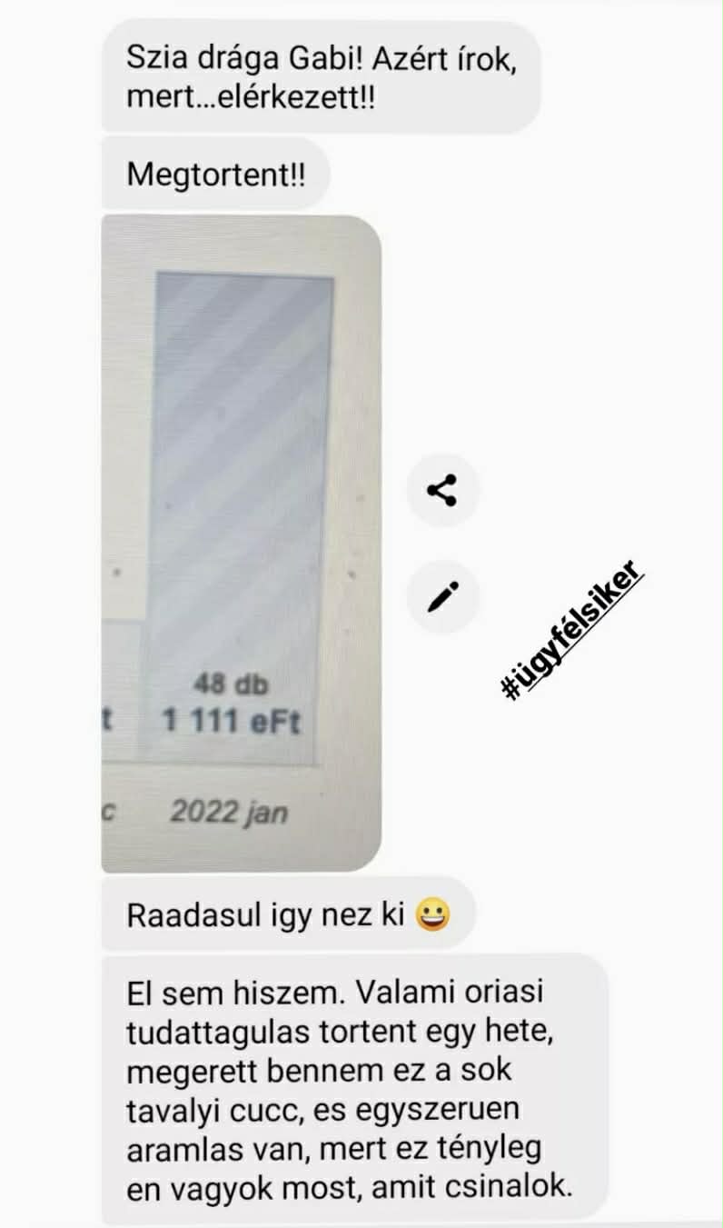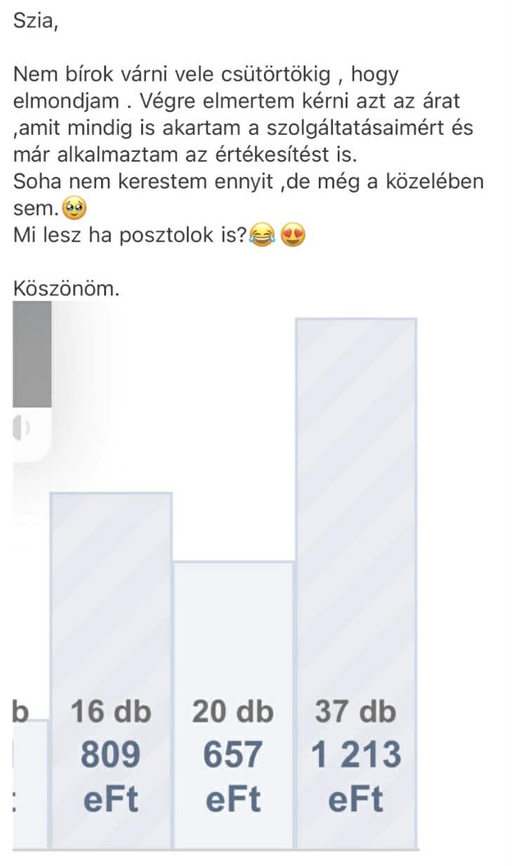 "Csak szerettem volna visszajelezni, hogy a hónapban 2,5 millió lett a bevételem. Köszönöm a munkádat!"